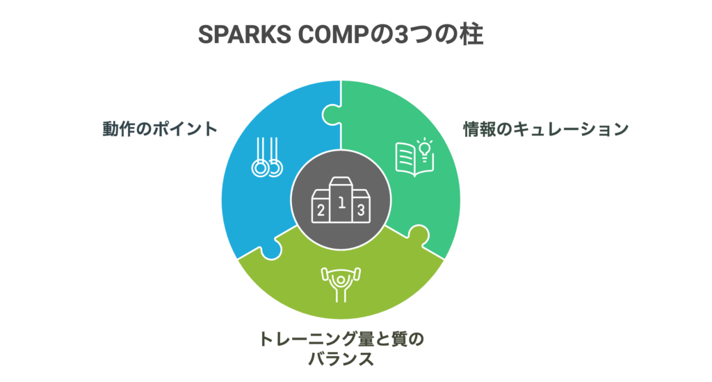この積み重ねによって、成長に最適なメソッドが導き出されました。SPARKS COMPETITORでは、この経験と知識をもとに、3つの柱であなたのトレーニングを全面的にサポートします。